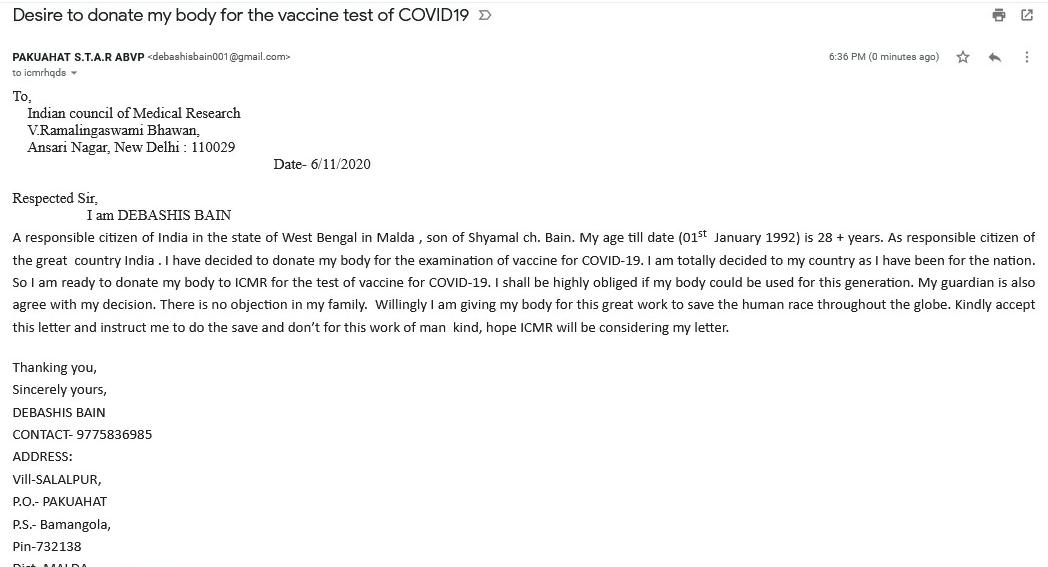 দেবাশীষ পাল :মালদাঃ-করোনা ভাইরাস প্রতিরোধে টিকা মানবদেহে পরিক্ষারমূলক প্রয়োগ করার জন্য নিজের উদ্যোগে এগিয়ে এলো এক যুবক। মালদহের বামনগোলা ব্লকে পাকুয়াহাটের, সালাল পুরের যুবক দেবাশীষ বাইন (২৮)অকিল ভারতীয় বিদ্যার্থী পরিষদের বামনগোলা ব্লকে সম্পাদক (Abvp) পিতা শ্যামল চন্দ্র বাইন পেশায়,পাকুয়াহাট স্কুলের পার্শ শিক্ষক,মা- খুখু বাইন। দেবাশীষ বাইন করোনা টিকা নিজের দেহে পরিক্ষার জন্য আবেদন পত্র অনলাইনে জমা করেন এখনো উত্তর এসে পৌছায়নি।