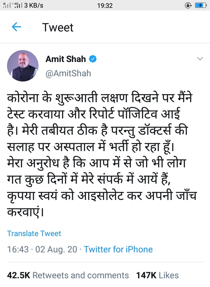 সৌজন্যে :ইন্টারনেট -এবার করোনার থাবায় মোদি সরকারের নম্বর-টু কেন্দ্রীয় স্বরাষ্ট্রমন্ত্রী অমিত শাহ। কোভিড-১৯ ভাইরাসে সংক্রমিত হয়েছেন সেই কথা রবিবার টুইট করে জানালেন অমিত শাহ নিজেই। এছাড়া তাঁকে দিল্লির অল ইন্ডিয়া ইনস্টিটিউট অফ মেডিকেল সায়েন্স বা AIIMS-ভর্তি করা হয়েছে।