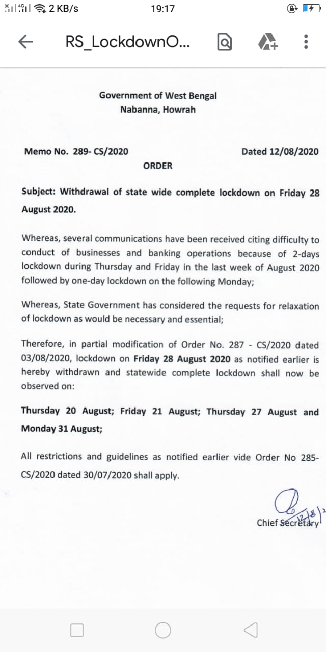রাজীব মন্ডল :কলকাতা  -আবার বদলে গেল রাজ্যে সম্পূর্ণ লকডাউনের দিন। বুধবার জানানো হয়েছে,  ২৮অগাস্ট  লকডাউন হবে না। আগে বলা হয়েছিল ২০, ২১, ২৭,২৮ ও ৩১ আগস্ট গোটা রাজ্যে সম্পূর্ণ লকডাউন থাকবে। এবার মুখ্যসচিবের দেওয়া  বিজ্ঞপ্তিতে বলা হল, ২৮ আগস্ট শুক্রবার লকডাউন হবে না। সরকারের তরফে জানানো হয়েছে, ব্যবসা ও ব্যাঙ্কের কাজে অসুবিধার কথা ভেবেই এই দিন বদল করা হয়েছে।এর আগে এটি মধ্যে ২ বার লকডাউনের দিন বদল হয়েছে।